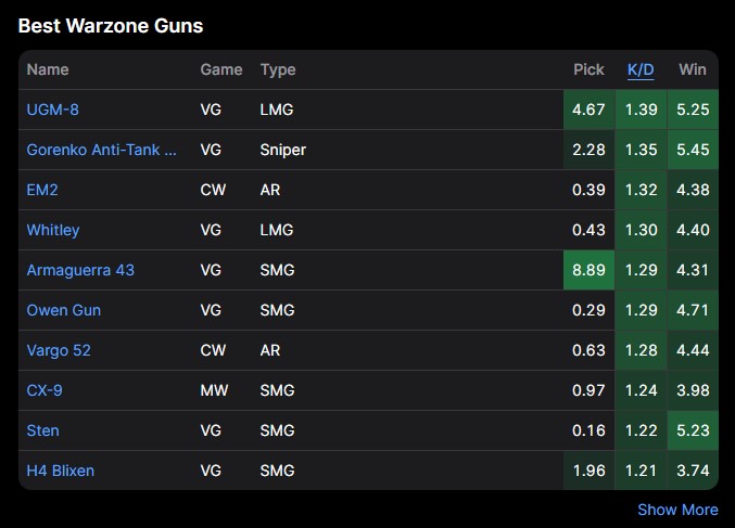 A fenti listát átböngészve jól látható, hogy a szebb korszakokat megélt PPSh-41, H4 Blixen is egyre jobban kezd lemorzsolódni. Az EM2 és Whitley nagy meglepetés az első ötben, de az erősítést kapott CX-9 vagy épp Vargo 52 is kezd egyre jobban feltörni. A következő 1-2 hét kritikus lehet akár meta, akár K/D arány szempontból, ám a K/D értékeken jól játszódik, hogy egészen sikeres volt a balanszolás. Az első és tizedik hely között mindössze 0.18 a különbség, míg voltak olyan időszakok is, amikor ez az első és második helyezett között volt ennyi.