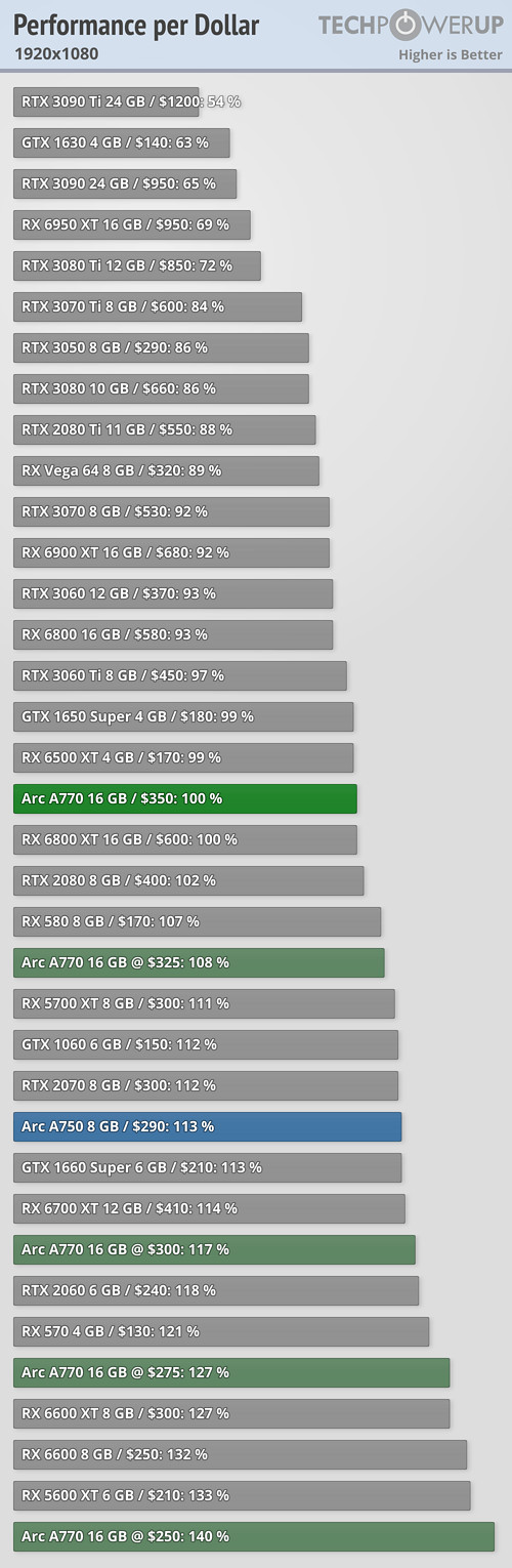Hivatalos európai és magyar árak híján csak a TechPowerUP táblázatára tudunk hagyatkozni, melyek a hivatalos, USA MSRP árakat használják. Ebben a kapott FPS értékeket a kártyák árával állítják szembe, így hamar kiderülhet, hogy mekkora teljesítményt kapunk a pénzünkért. Szerencsére itt már sokkal biztatóbb helyezéseket érnek el a modellek, ám a mostaninál egy fokkal agresszívabb árazásra lenne szükség, hogy kihagyhatatlan vételnek minősüljenek.