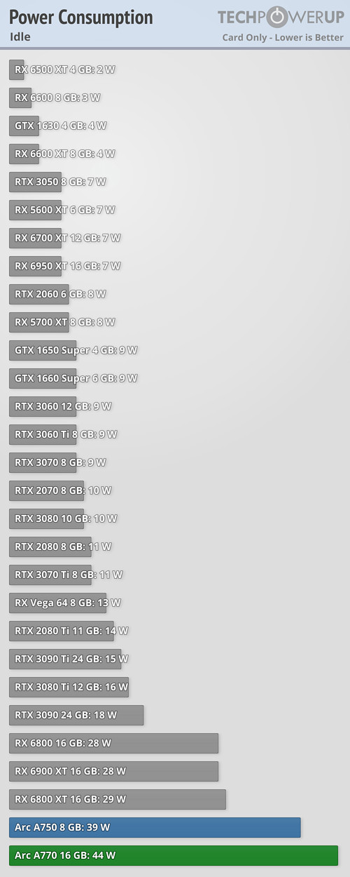 A játékok alatti fogyasztás teljesen megszokott tartományban van, ám az világosan látható, hogy azonos teljesítményért többet kérnek maguknak az Intel kártyák. Ami ennél is aggasztóbb, hogy az „Idle” fogyasztás, mely sokkal erősebb kártyák esetében is 10-15 watt körül alakul, az Intel kártyáinál a 40 wattos határokat karcolgatja. Ez bizony hatalmas hátrányként is elkönyvelhető, ám azt sem szabad elfelejtenünk, hogy még finomíthatnak ezen szoftveres oldalról a mérnökök.