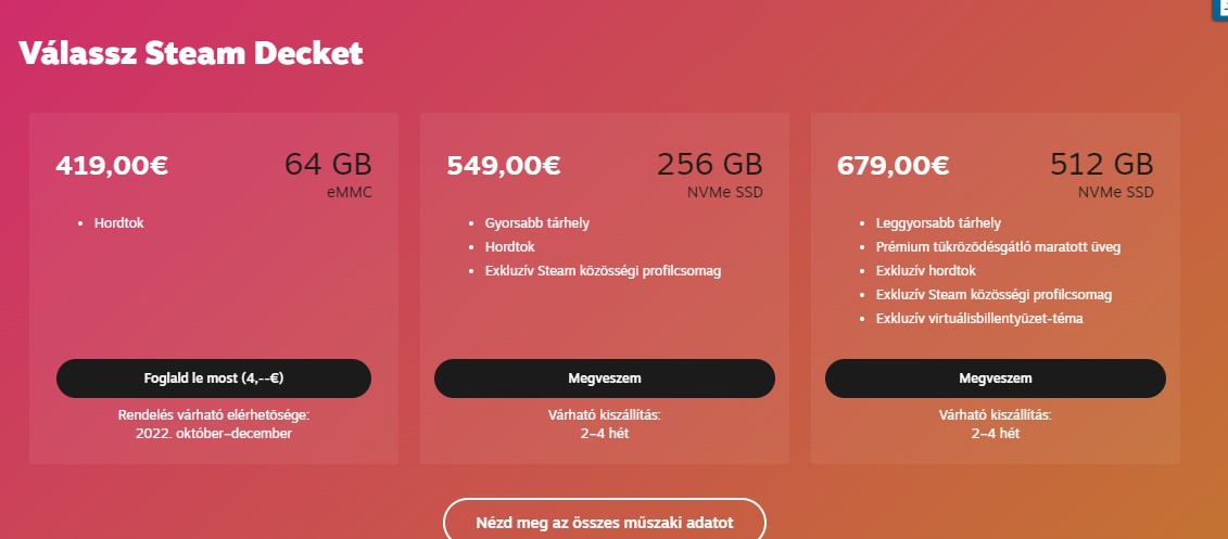 A Steam Deck hazai weboldalán is már a „Megveszem” felirat szerepel, 2-4 hetes szállítási idővel. A CS:GO és a különféle, drága skinek tulajdonosainak külön jó hír, hogy továbbra is fizethetjük Steam Walletből is az összeget. Talán egy fokkal jobban járnak, ha az eszközt adják el és nem 60%-os ár alatt a skineket. A cég felhívja a figyelmet, hogy bár bőséges raktárkészlettel rendelkeznek, adott kereslet felett ismét visszatérhet a foglalásos rendszer. Ezt érdemes átgondolni az ünnepi időszak előtt, hiszen egy-egy karácsonyi vagy november végi roham keresztbe is húzhatja a számításainkat.