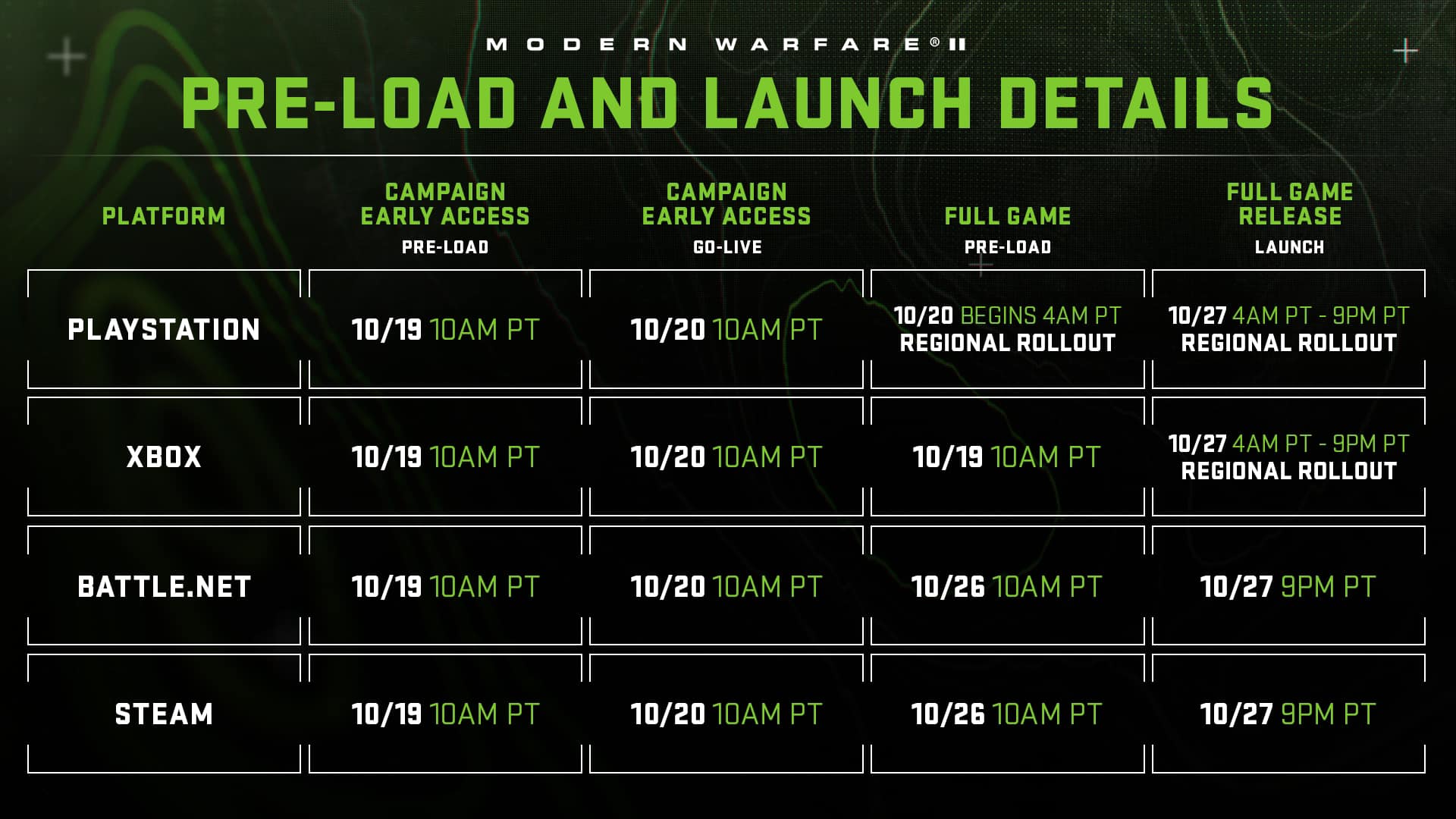 A Call of Duty fejlesztői hivatalosan is közzétették, hogy mikor startol el a Modern Warfare II előtöltése és mikor indulhat a móka. Szerencsére egy viszonylag átlátható táblázatot kaptunk, így hamar képbe kerülhetünk a most már biztos időpontokkal. Nagy meglepetésre nem kell számítanunk, ám sosem árt, ha a kiadó zöld utat ad a startra.