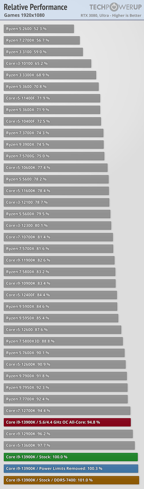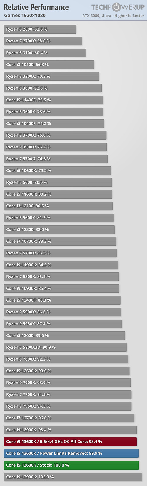 Jól látható, hogy az Intel újdonságai játékok alatt az abszolút legjobb kategóriát képviselik, a jelenleg elérhető kínálatból bizony a Raptor Lake processzorok tudják a legtöbb FPS-t kisajtolni. Jól látható, hogy az i5-13600K és i9-13900K között játékok alatt 3% különbség sincs, így általános jellegű gamingre a 13600K bombabiztos ajánlat, nem érdemes feljebb nézelődnünk.