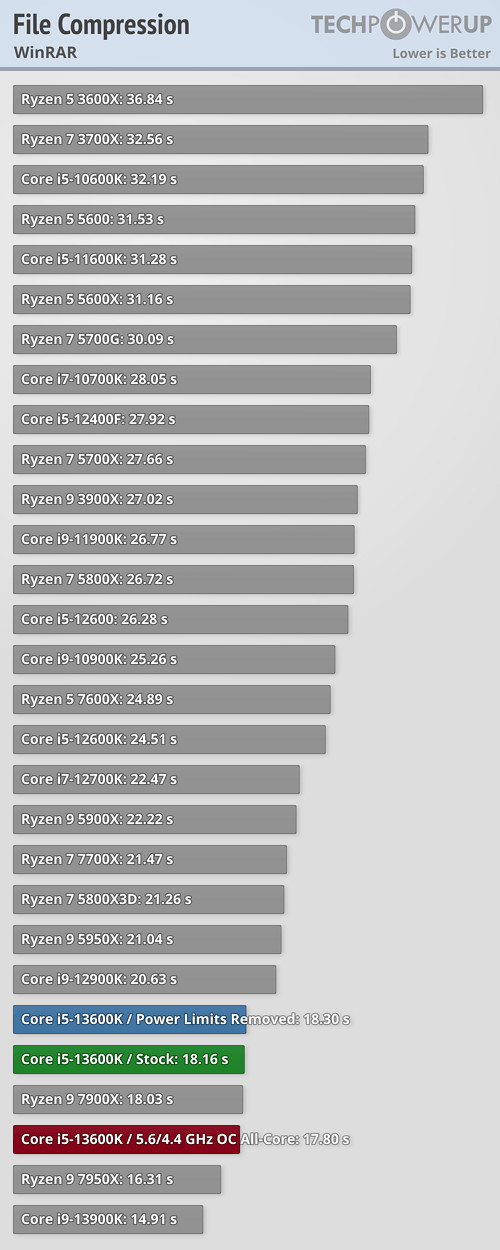 A konkrét grafikonok előtt érdemes kiemelni, hogy a 13600K 6+8 felépítést kapott. Azaz 6 nagyteljesítményű és 8 nagy energiahatékonyságú mag végzi a dolgát, összesen 20 (6*2+8) szálat használhat az operációs rendszer. Az i9-13900K erre rátesz pár lapáttal, hiszen 8+16 felépítést kapott, azaz 32 szál áll a Windows 11 rendelkezésére. Az adatokat a TechPowerUP tesztjéből válogattuk ki.