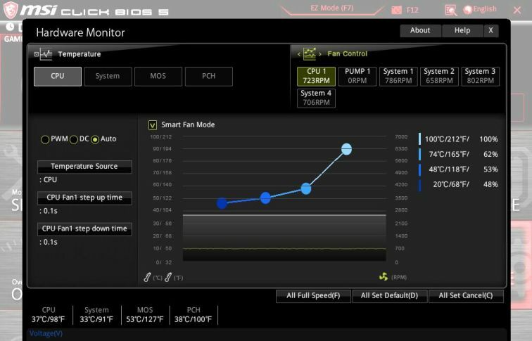 A kialakítás, kinézet gyártóként eltérhet, ám a fő cél mindegyiknél azonos. Adott hőmérséklethez rendelhetünk adott ventilátorfordulatot. A fenti képen az MSI BIOS-ában és Windows alkalmazásában található görbéket láthatjuk. Jól leolvasható, hogy 20 fokos CPU hőmérsékletnél még csak 48%-on jár a venti, 74 fok felett pedig már 62%-on járatja. Rengeteg esetben a gyártó túl óvatos görbét ad meg alapból, így akkor is magas fordulatszámon járnak a ventilátorok, ha a hőmérséklet még csak nem is indokolja. Érdemes lehet elszórakozni pár délutánt a saját görbéink kialakításával.