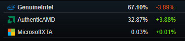 Azt már tudjuk, hogy a 6 magos példányok a legnépszerűbbek, ám remek kérdés, hogy mely márka mellé húz a játékosok szíve. Annak ellenére, hogy az AMD a Ryzen processzorokkal CPU fronton is kiváló termékekkel örvendezteti meg a játékosokat, továbbra is az Intel az úr ebben a kategóriában. A Steamet futtató gépek 67%-ában Intel processzor ketyeg, ám novemberben ez még 70% volt.