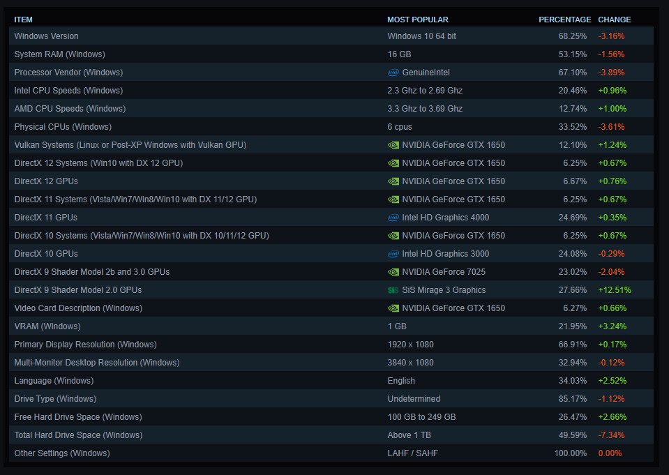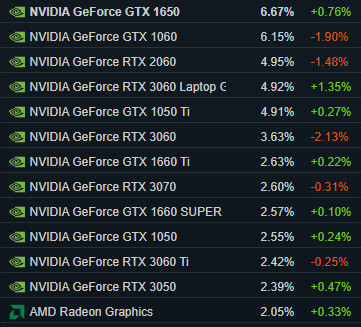 Hosszú hónapok, talán évek GTX 1060 uralma után megtört a jég, immár a GTX 1650 vezet minden kategóriában, ám a RTX 2060 szorosan lohol a nyomukban. Az elmúlt hónapokban az RTX 3060 asztali és mobil változatai voltak a legnépszerűbbek a felhasználók körében, az egyre csökkenő áraknak köszönhetően egyre több játékos gépébe került aktuális generációból származó GPU. A térhódításra azért még várnunk kell, de egészen a negyedik helyig szárnyalt novemberre az RTX 3060 hordozható változata. Érdekesség, hogy a DirectX 10,11,12 és Vulkan GPU ranglistában az első 10 helyen kizárólag csak Nvidia videókártyát találunk.