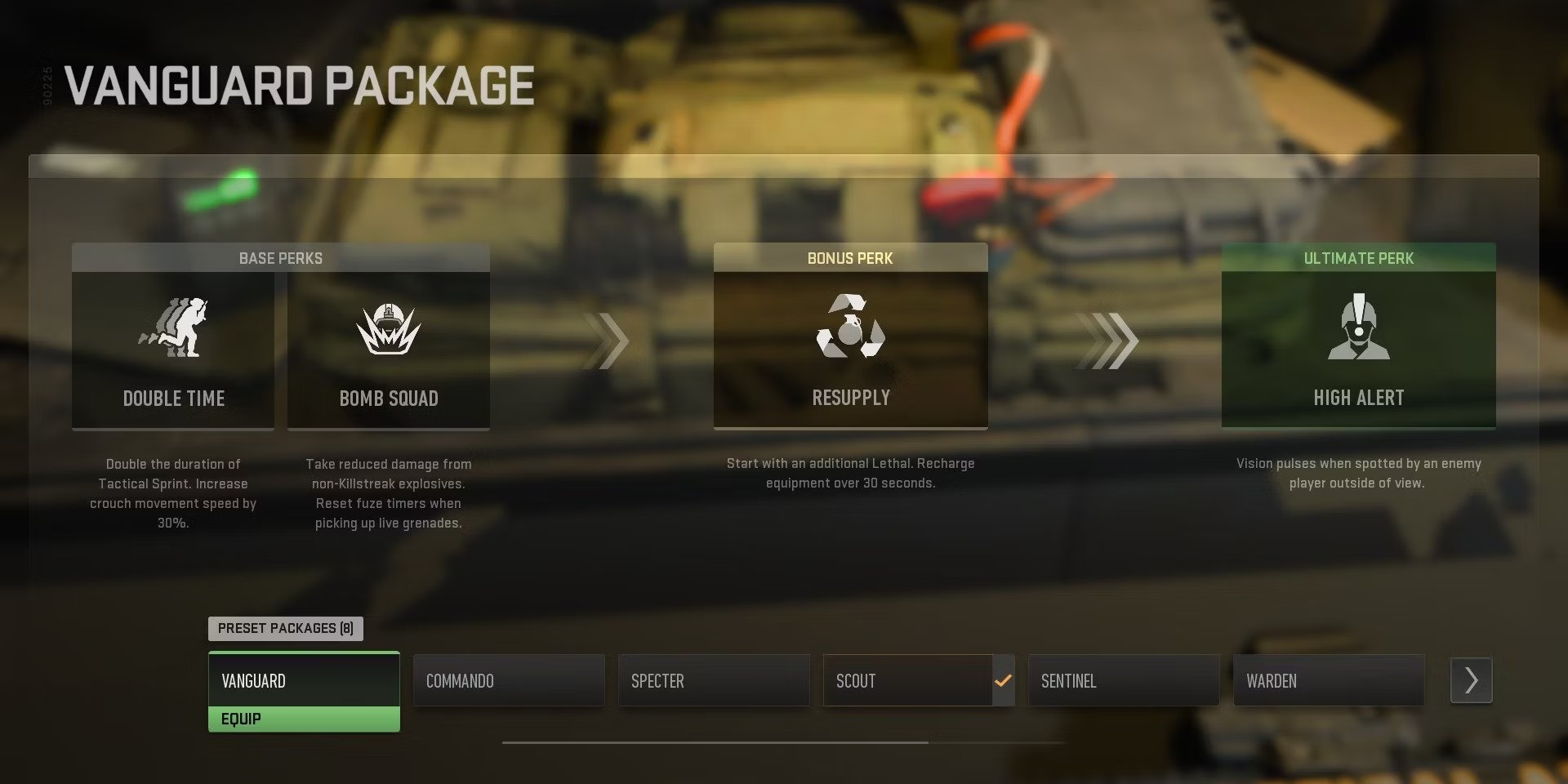 Harmadik helyet egyértelműen a Vanguard Perk Package viheti haza. A csomag a Double Time, Bomb Squad, Resupply, és High Alert perkeket tartalmazza. Kellemes kombináció lehet azoknak, akik a Ghost vagy Overkill perkeket valamiért nem kedvelik. A Bomb Squad extrém hasznos lehet Warzone 2.0-ben, hiszen a nem Killstreak explosive sebzések mértékét csökkenti. A High Alert pedig azoknak jöhet igazán jól, akik nehezebben szúrják ki ellenfeleiket, a Perk jelzi, ha látótávolságunkon kívül spotolt minket valaki.