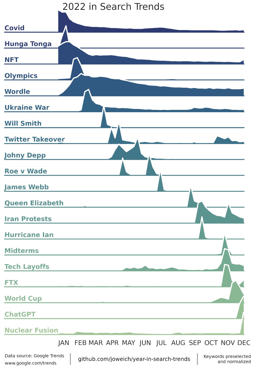 A fenti képet Neville Medhorának köszönhetjük. Jól látható, hogy az év első felében a COVID és az NFT-k vitték a prímet, illetve a három évtizede nem látott kitörést produkáló víz alatti vulkán, a Hunga Tonga. A Wordle valamikor februárban indult világkörüli útjára, szépen leolvasható, hogy a népszerűsége azóta is kifejezetten magas a felhasználók körében.