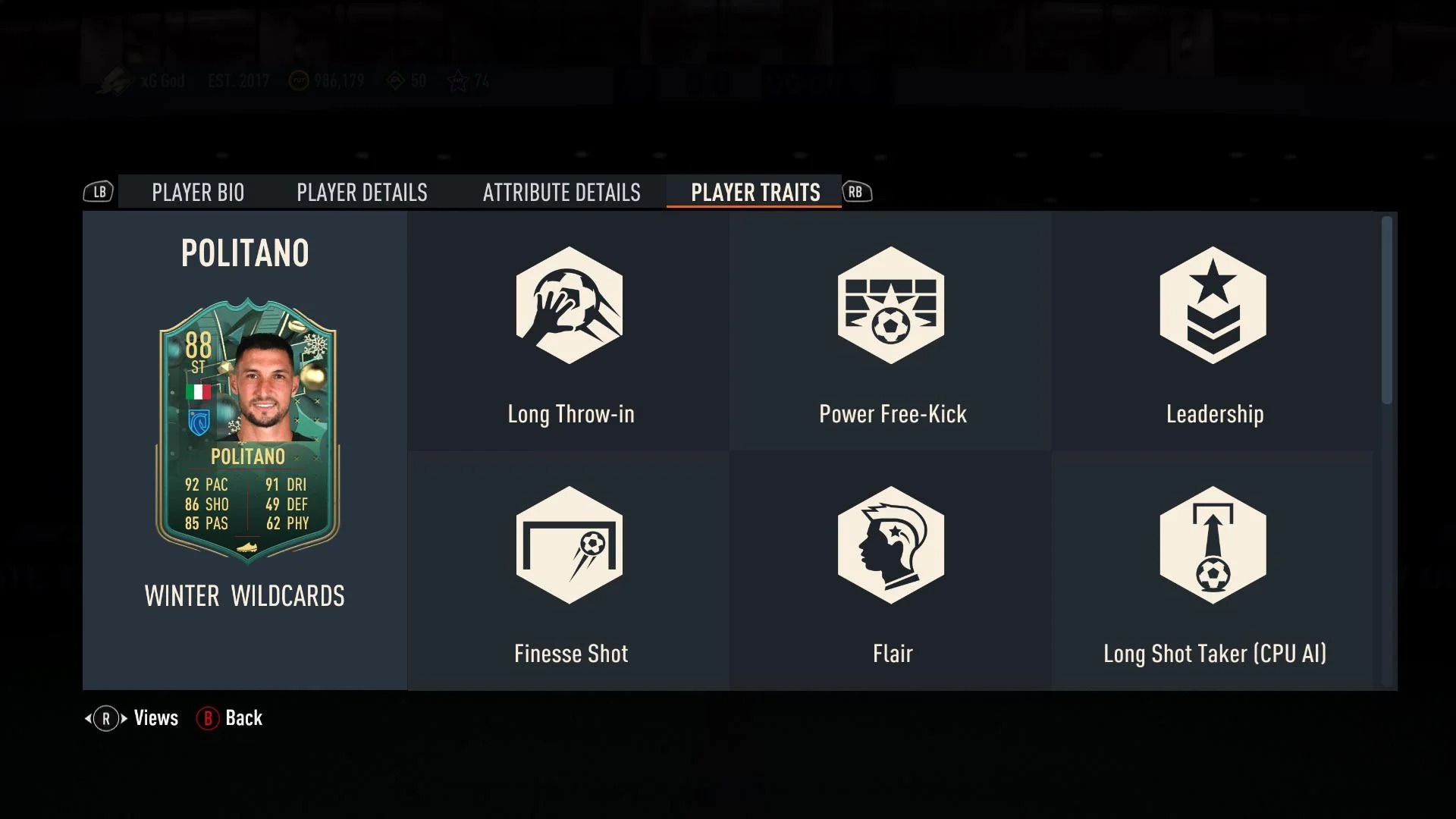 De a hab a tortán nem itt keresendő, hanem a Trait menüpontban. Mint kiderült, Politano összesen 14(!!!) Traitet kapott, amik között persze ott van az Outside Foot Shot és a Finess Shot is. Ezek mellett hatalmasakat dob be, kiváló a rögzített szituációkban, erősen lő szabadrúgást, nem ingadozik a játéka, távolról is veszélyes, na meg még teljesen új, a közösség által nem ismert hatású Traiteket is ráaggattak a kanadaiak.