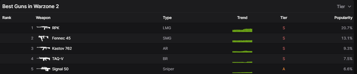 Az elmúlt hetek során többször is érintettük a Warzone 2.0 egyes fegyverkategóriáit, ám egységesen csak egyszer. A Season 1 Reloaded frissítés után kissé átrendeződtek az erőviszonyok, ám az abszolút kedvenceket nem igazán sikerült letaszítani a trónról. A Combat Records és a hozzá tartozó API továbbra sem éles, így részletes statisztikákkal nem szolgálhatunk. Ám abban biztosak lehetünk, hogy a jelenlegi TOP 5 fegyvert nem igazán kérdőjelezi meg senki. A WZRankednek azonban valamilyen módon sikerült a legjobb fegyvereket felsorakoztatnia, így pontosabb adatokkal is rendelkezünk, bár közel sem annyival, mint az eredeti kliens esetén: