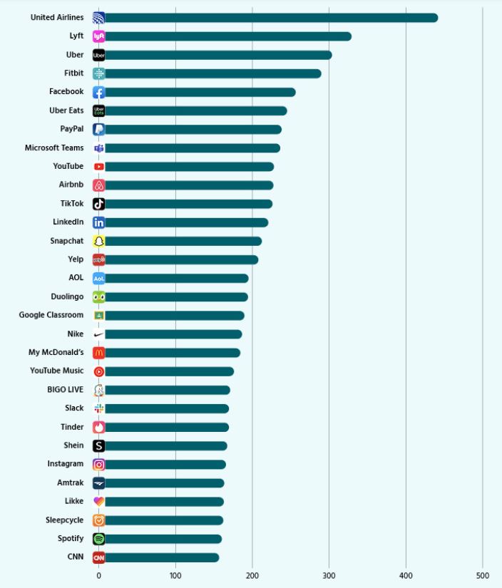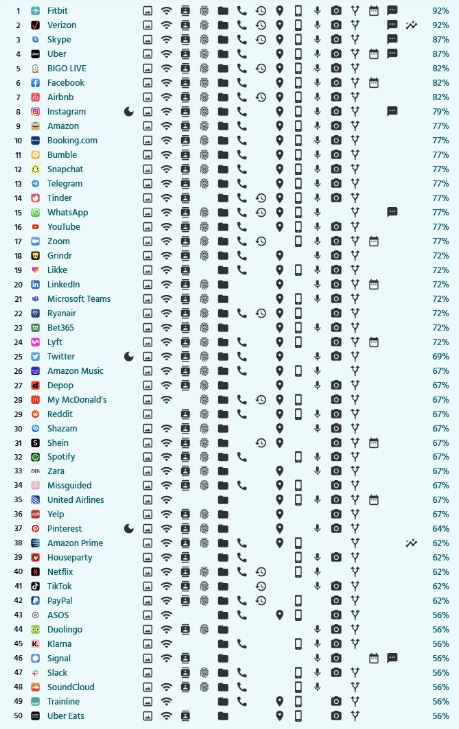 Az aksi a közösségi médiát és a randiappokat utálja a legjobban, ám a legéhesebb még így is egy edzőprogram. Gusztustalanul sokat esznek még a csevegők, a konferenciaszervezők és a videó lejátszók, míg a legnagyobb helyet foglaló appok külön listát is megérnek – ezek bajnokai utazással kapcsolatos szolgáltatásokat kínálnak.