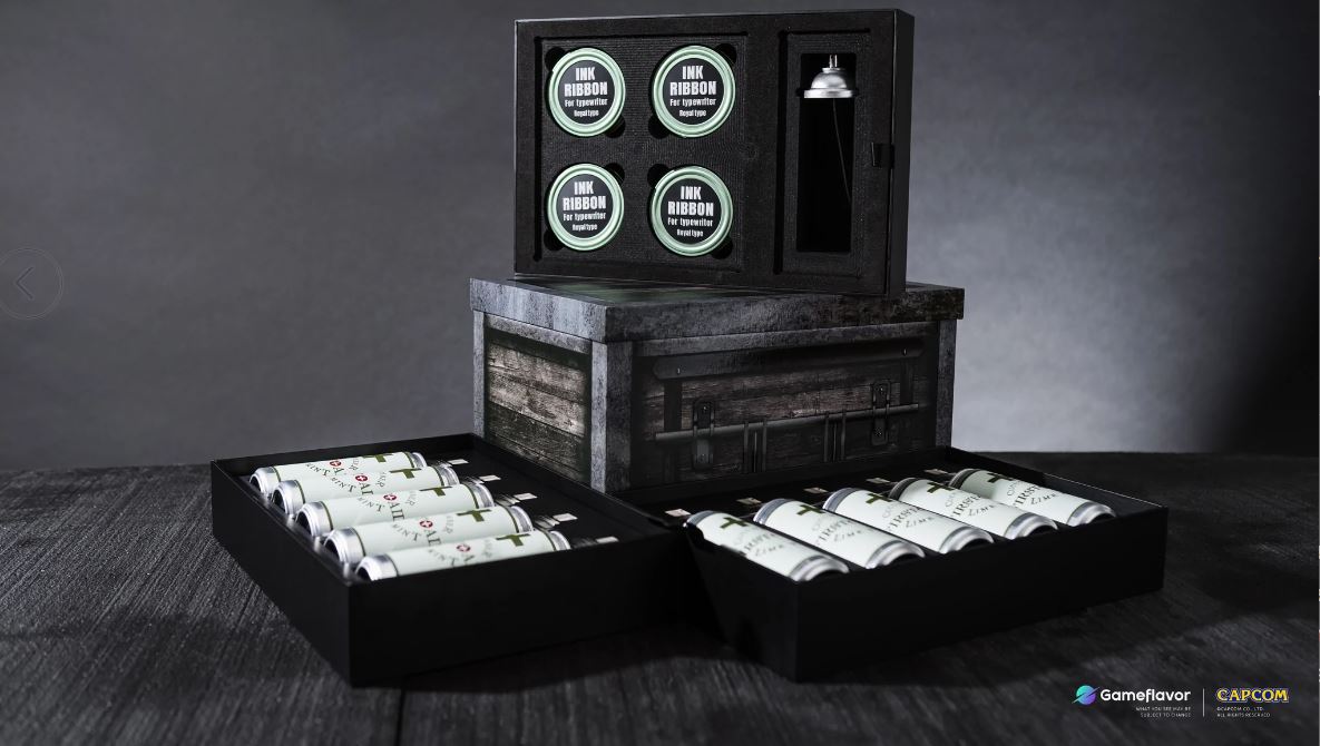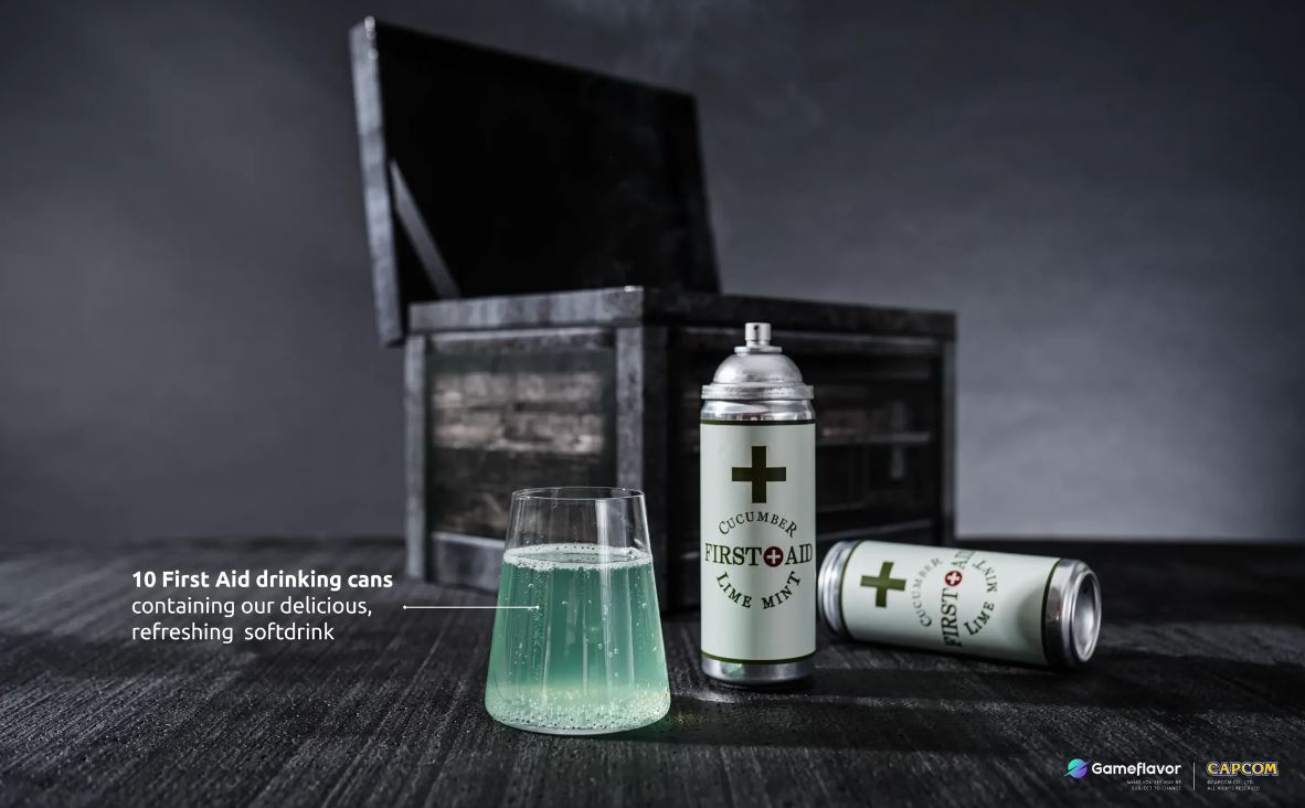 A First Aid Drink Collector’s Box tíz darabot tartalmaz az uborka-menta-lime ízű üdítőből, de van benne 4 tintaszalag, egy, az első Resident Evil által ihletett spray kupak, néhány Resident Evil témájú, alkoholmentes koktélrecept, eredetiségigazolás és még egy művészi album is.