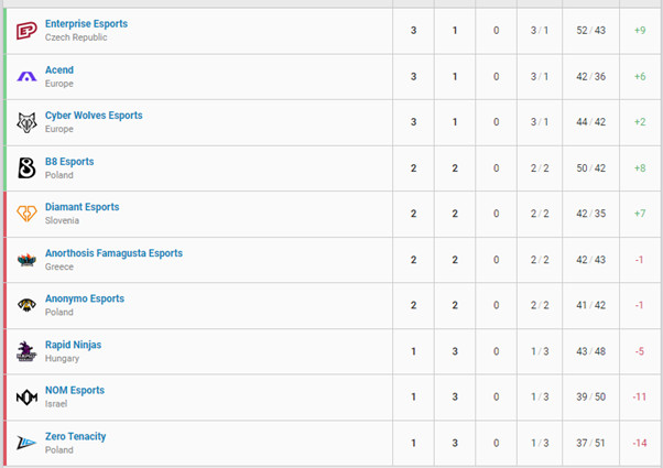 Az előző heti meccsek eredményei után, jelenleg az Enterprise Esports vezeti a tabellát 3 nyert meccsel.