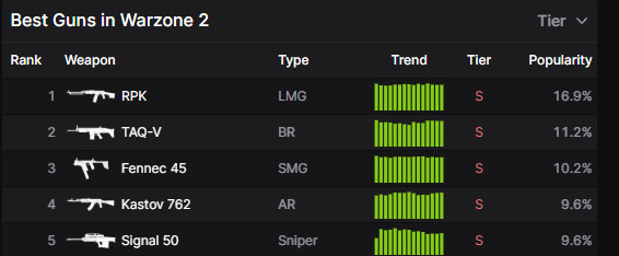Az elmúlt hetek során többször is érintettük a Warzone 2.0 egyes fegyverkategóriáit, ám egységesen csak egyszer. A Season 1 Reloaded frissítés után kissé átrendeződtek az erőviszonyok, ám az abszolút kedvenceket nem igazán sikerült letaszítani a trónról. A Combat Records és a hozzá tartozó API továbbra sem éles, így részletes statisztikákkal nem szolgálhatunk. Ám abban biztosak lehetünk, hogy a jelenlegi TOP 5 fegyvert nem igazán kérdőjelezi meg senki. A WZRankednek azonban valamilyen módon sikerült a legjobb fegyvereket felsorakoztatnia, így pontosabb adatokkal is rendelkezünk, bár közel sem annyival, mint az eredeti kliens esetén:
