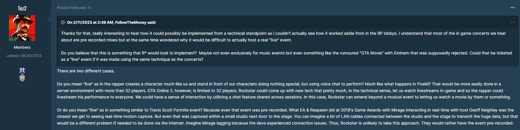 Tez2, a Rockstar fórum egyik veterán szivárogtatója árult el néhány dolgot. A GTA Online 2, nevezzük csak így, nem olyan típusú szerverek hajtják majd, mint a jelenlegi változatot. Néhány funkcióhoz nem is kellenek majd konkrétan a szerverek, hanem P2P alapon kommunikálnak a játékosok kliensei. A Rockstar Cloud szolgáltatása és a Socialclub is fontosabb szerepet vállal majd. A játékosok maximális száma valahol 32 környékén lehet majd és Fortnite-hoz hasonló eseményeket sem tart elképzelhetetlennek Tez2. A fenti változásnak köszönhetően azonban sokkal nehezebb lesz összehozni külsős szervert, ám a közösség eddig mindenre talált megoldást.
