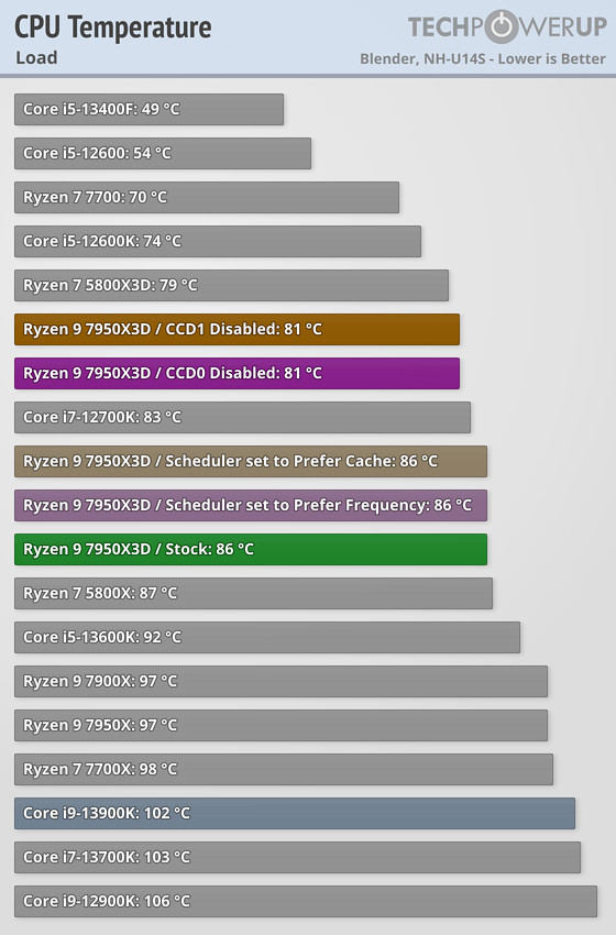 Az AMD már szeptemberben figyelmeztette is a vevőket és tesztereket, hogy ne lepődjenek meg a 95 fokon. Ezen a hőmérsékleten gyakorlatilag évekig jól érzik magukat a Zen 4 példányok, hiába tűnnek vészesnek az elmúlt generációk mérései után. A 3D variánsoknál a 95 fok 86-89 fok környékére csillapodott. A processzorok tervezetten engedik magukat eddig a tartományig, hacsak manuálisan nem szólunk bele. Természetesen egy kis finomhangolással máris barátságosabb hőmérsékletet kaptak a TechPowerUP munkatársai is.