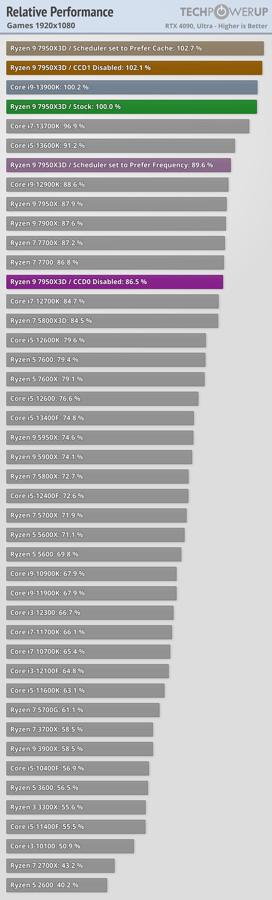 A fenti képen tehát a 7950X3D-t és a CCD1/CCD0 tiltott, kamu 7800X3D-t is megtalálhatjuk. Több dolgot is megfigyelhetünk a százalékokat böngészve. Egyrészt jól látható, hogy a legjobbak közé érkezett az AMD, többé nem kell félni sem a 12. sem a 13. generációktól játékok alatt. Másrészt ismételten érdemes kiemelnünk a korábbi generáció 5800X3D modelljét, mely az AM4 alaplapok tulajdonosai számára kiváló alternatíva lehet a teljes váltás helyett.