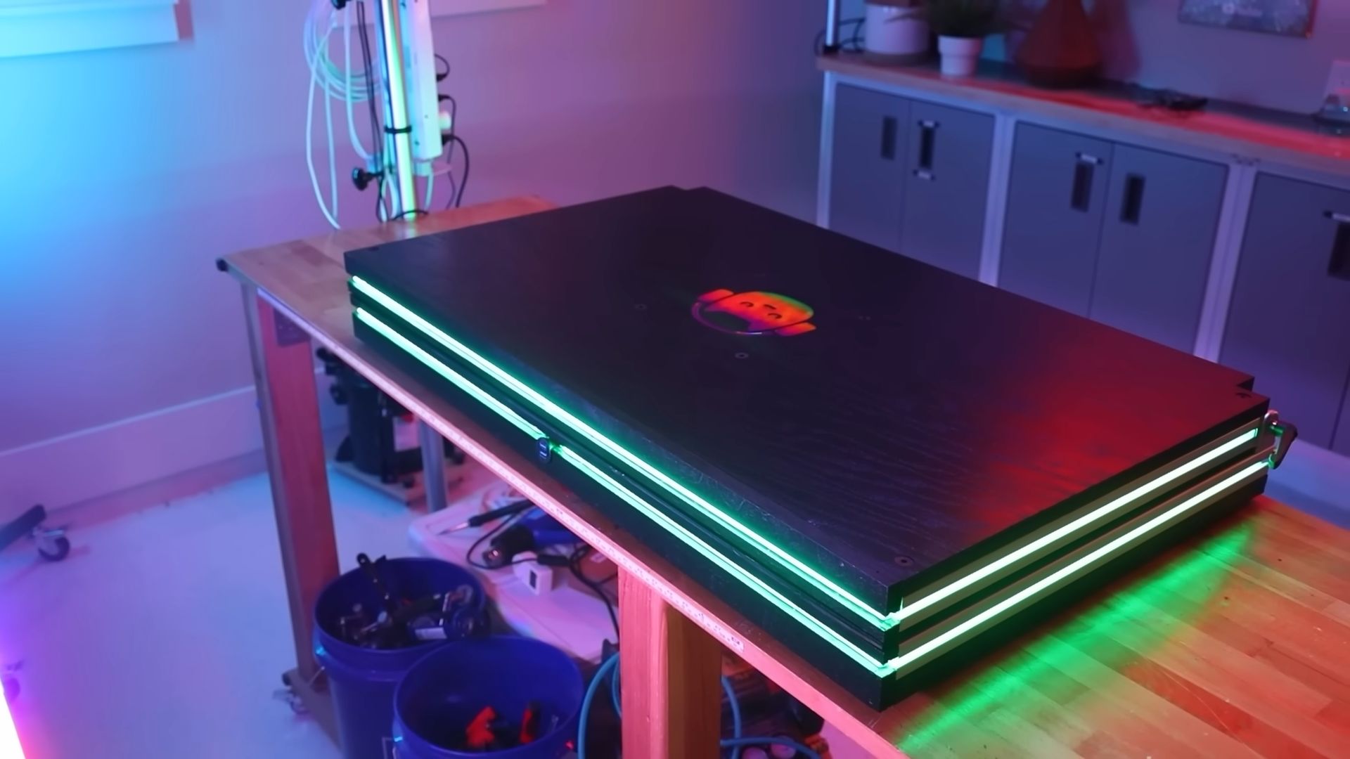 A gép lelkét az Intel NUC 11 adja, melyet a házban rejtettek el a kitalálói. Ennek megfelelően egy Core i7-1165G7 processzor végzi a számításokat, mindezt egy RTX 2060 társaságában. Egy USB hubot is sikerült elrejteni a belsejében, így rengeteg eszköz csatlakoztatható a méretes gépre. A teljes gamer élmény érdekében az RGB sem maradhatott ki, így garantáltan nem fog leszólni minket a társaság. A laptop összefogyasztása 260 watt körül alakul, melynek jelentős részét a megjelenítő teheti ki. Csak hogy legyen egy kis viszonyítási alapunk, a mai napig legnagyobb laptopként emlegetett Acer Predator X21 mindössze 21 inches kijelzővel rendelkezett és 8.5 kiló alatt volt a súlya.