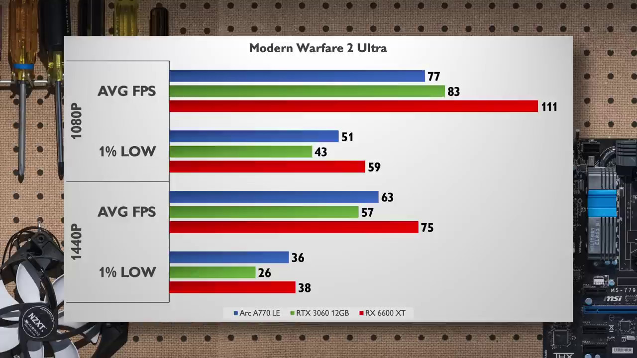 A felhozatalból három játékot emeltünk ki. Nem véletlenül. A Modern Warfare II tesztje megmutatja, hogy néhány címben micsoda domináló erőre képes az AMD kártyája. A Cyberpunk 2077 arra világít rá, hogy az Intelnek még mindig szüksége van némi optimalizációra. A Borderlands viszont azt prezentálja tökéletesen, hogy frissebb DirectX API alatt mennyire jól viselkedik az ARC A770.