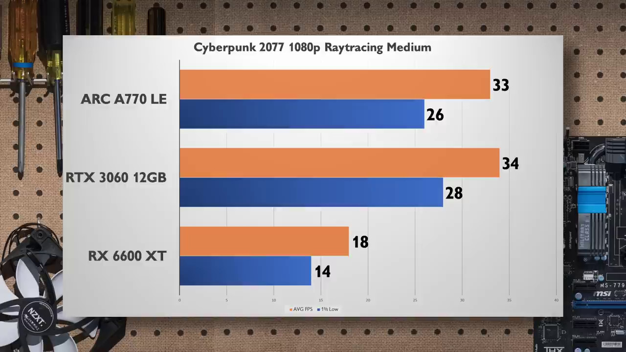 Cyberpunk 2077 Ray Tracing alatt izzadtak a kártyák. Ahogy arra számítani lehetett, az AMD kártya elvérzett elég kellemetlenül. Ami azonban érdekes lehet, hogy az Intel szinte az RTX 3060 szintjét tudta hozni, holott sokáig az Nvidia kizárólagos terepe volt a Ray Tracing világa.