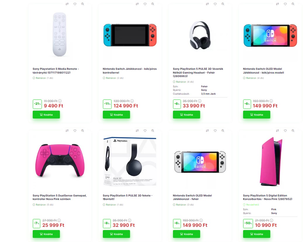 Gondolkodsz egy Switch beszerzésén vagy csak a PlayStation 5 konzolodat dobnád fel? Szintén jó helyen jársz. Kedvezményes árakon csaphatsz le kontrollerre, fejhallgatóra vagy épp a könnyedén kicserélhető konzolborításra. Pillanatok alatt egyedivé varázsolhatod a Sony konzolját. Switchből már az új, OLED kijelzős változattal is találkozhatunk, mely magasabb szintre emeli az amúgy is kiváló, Nintendo játékok adta élményt.