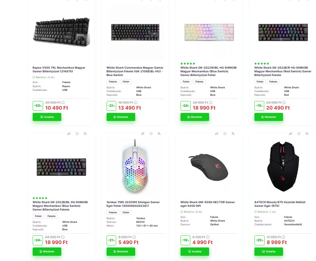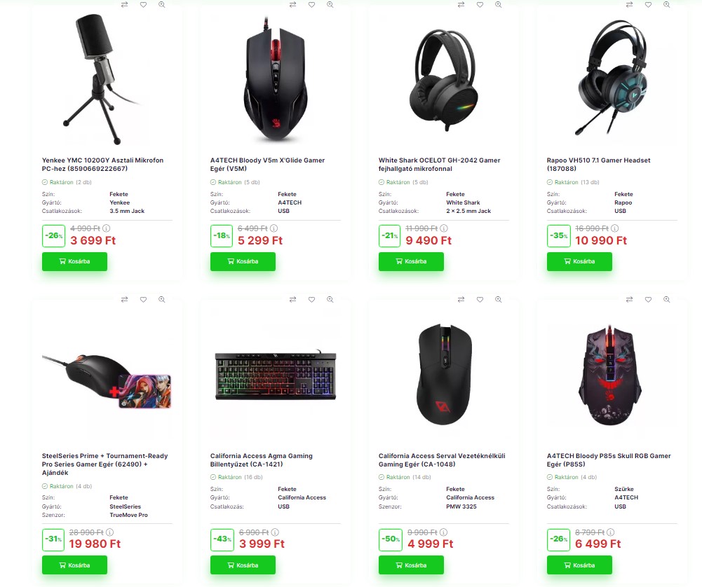 A fő kategóriában több mint 130 termék várja kedvezményes áron a vásárlókat. Ezúttal sem mehetünk el a Shinobi billentyűzet mellett, mely hosszú hónapok óta az egyik legnagyobb ár-érték bajnok a piacon. Természetesen fejhallgatókat, egereket, egérpadokat, de akár még mikrofonokat is találunk a repertoárban.