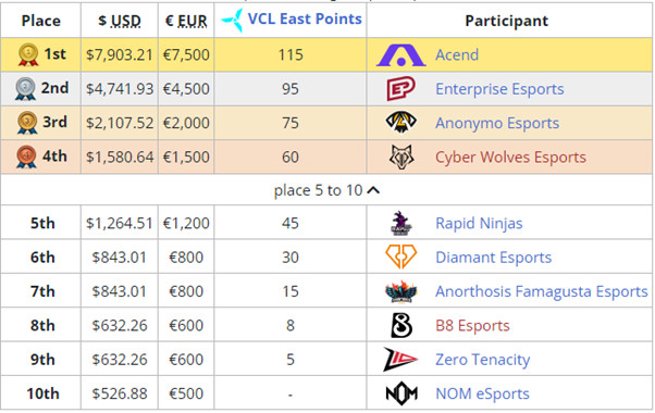 Ezzel a Rapid Ninjas az 5. helyen végzett, így 1200 eurót és 45 pontot szereztek a ligában.