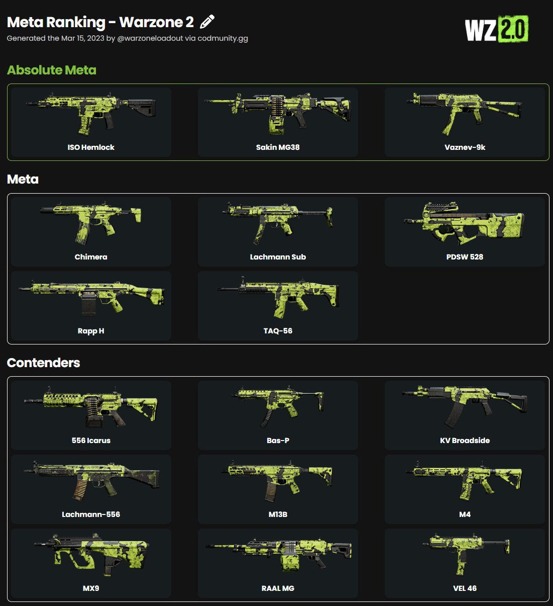 Szerencsére nem csak bennünk és a játékosokban merültek fel ezek a kérdések. Warzone Loadout a statisztikák, a korábbi és az új tapasztalatok alapján egy listát állított fel a jelenlegi helyzetről. Nem biztos, hogy ez teljesen tükrözi majd a valós, WZRanked képet, de nagy átfedésre számíthatunk.