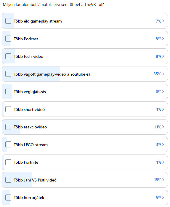 Az egyébként több mint 100 ezer főt számláló csoport ugyan nagyon kis része szavazott, ugyanakkor már ez is képet adhat arról, hogy a többség milyen típusú tartalomból látna szívesen többet. A cikk írásának pillanatában 3910 szavazat alapján mutatjuk az (eddigi) eredményt.