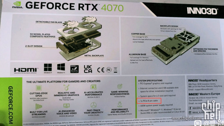 Az Inno3D RTX 4070 doboza idő előtt került fel az internetre. Azt azonban világosan leolvashatjuk róla, hogy a régi, 8-pines csatlakozót fogja majd használni. Abból is egészen pontosan egy darabot. Nem véletlenül, hiszen papíron az RTX 4070 egy 200 wattos kártya, így a tápkábel 150 wattja és a slotból elkérhető 75W bőven lefedi majd az újonc igényeit. Természetesen előfordulhat, hogy néhány gyártó az új megoldást fogja választani, ám öröm látni, hogy lesz lehetőségünk választani ilyen téren is.