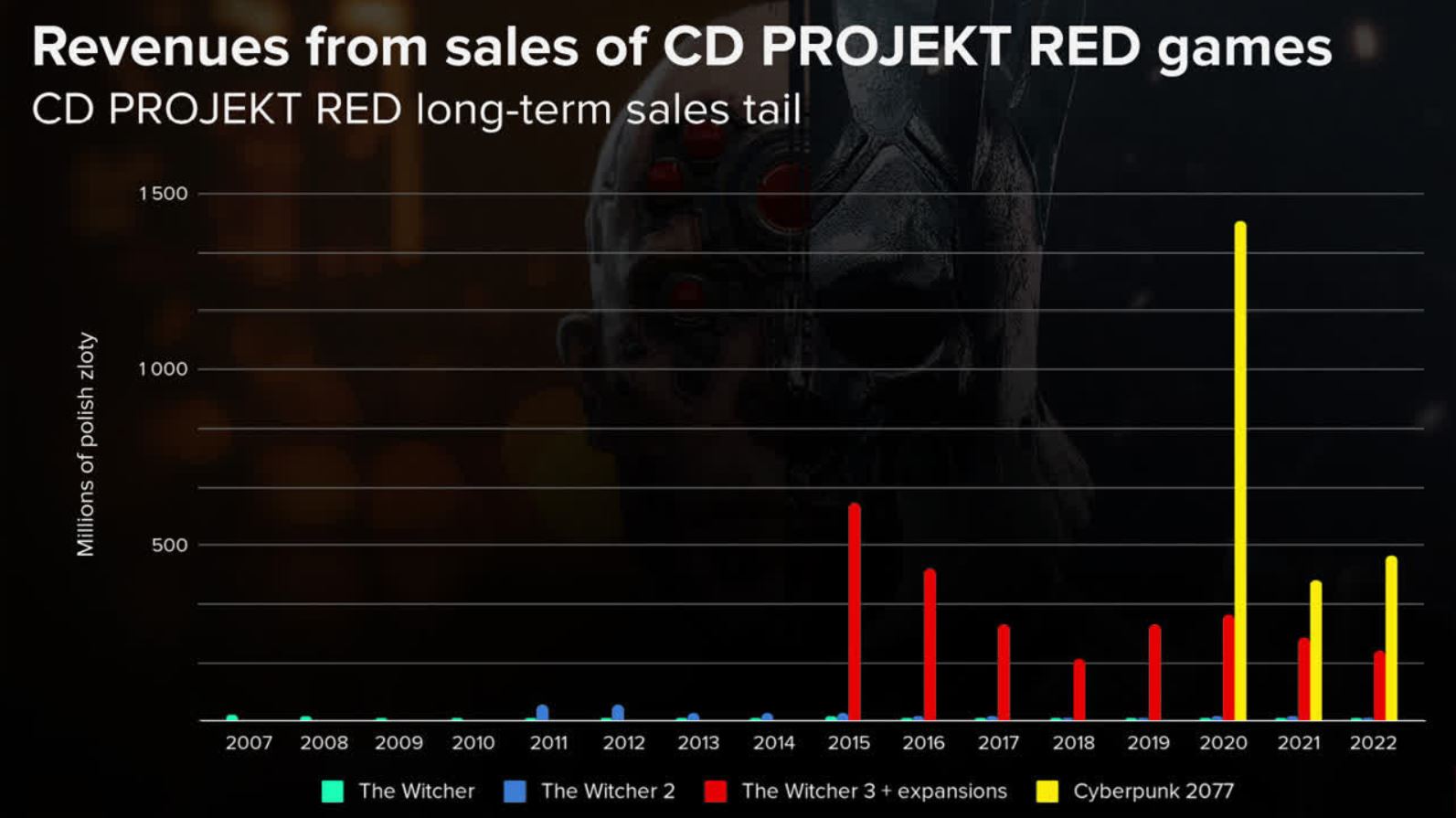 Ahogy az a diagramon is látszik, a stúdiót évekig csak a The Witcher 3 tartotta a felszínen, majd jött a Cyberpunk rövid tündöklése és gyors bukása. A CD Projekt viszont bebizonyította, hogy nagy küzdő: a Witcherhez kiadott bővítményekkel és a helyrepofozott Cyberpunkkal újra halmozza a bevételeket: az eladásoknak köszönhetően a 2021-es 207 millió után tavaly már 222 millió dollár (kb. 77,7 milliárd forint) folyt be. Nem csak annyival kerestek viszont többet, mint amennyi a léptékekhez képest soványnak tűnő különbözet, hiszen költés-bevétel arányában a növekedésük 66 százalékos volt, így tisztán 81 millió dollár (28,35 milliárd forint) volt a haszon. Nem rossz, annyi bukdácsolás után, amit el bírtak követni.