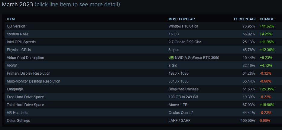 Ilyen mértékű változásokra az elmúlt hónapokban nem igazán volt példa. Ha az összképet nézzük, hamar kiderülhetett, hogy miért. Úgy tűnik, hogy a Valve a kínai felhasználókat jobban monitorozza, hiszen a korábbi 25%-os angol felhasználói bázis helyett közel 50%-os kínai nyelv preferenciát olvashatunk le. Így a keleti országban használt hardverek és szoftverek jelentősen módosíthatták az eddig megszokott trendet, ezért voltak akkora eltérések a márciusi és az áprilisi adatok között.