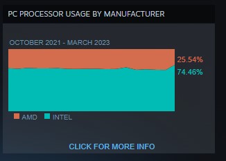 Azt már tudjuk, hogy a 6 magos példányok a legnépszerűbbek, ám remek kérdés, hogy mely márka mellé húz a játékosok szíve. Annak ellenére, hogy az AMD a Ryzen processzorokkal CPU fronton is kiváló termékekkel örvendezteti meg a játékosokat, továbbra is az Intel az úr ebben a kategóriában. Itt is hatalmas változást olvashatunk le, a márciusi 66% helyett immár 74%-on csücsül az Intel, szépen látható az ugrás a grafikonon is.