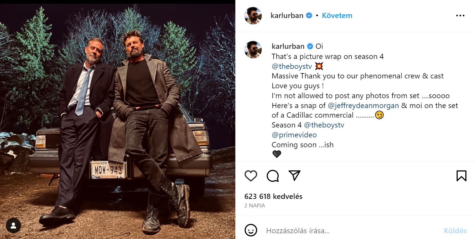 Befejeződött az Amazon Prime minden szempontból minden elképzelést felülmúló sorozatának legutóbbi forgatása, amivel végre dobozba került a jó ideje várt 4. évad. A jól végzett munka örömére a főszereplő Karl Urban és a sztoriba az új évaddal belépő Jeffrey Dean Morgan posztolt közös képet. Utóbbi a The Walking Dead befejeztével ért rá, hogy belevágjon egy új projektbe, de egyelőre nem tisztázott, hogy milyen szerepe lesz a The Boysban – jegyzi meg a GameStar.