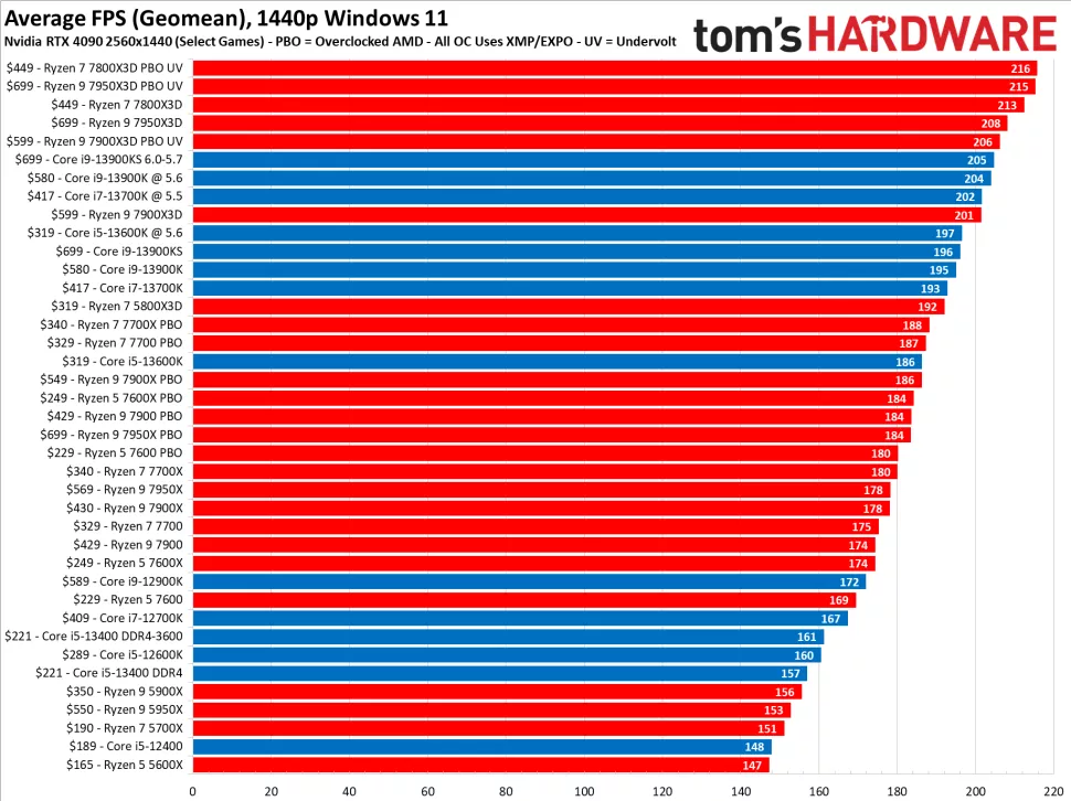 Ebben a szekcióban azt láthatjuk, hogy a Tom’s Hardware sokrétű és rengeteg játékot, programot futtató tesztjén mennyi FPS-t produkáltak az egyes processzorok 1440p felbontásban, Windows 11 alatt.
