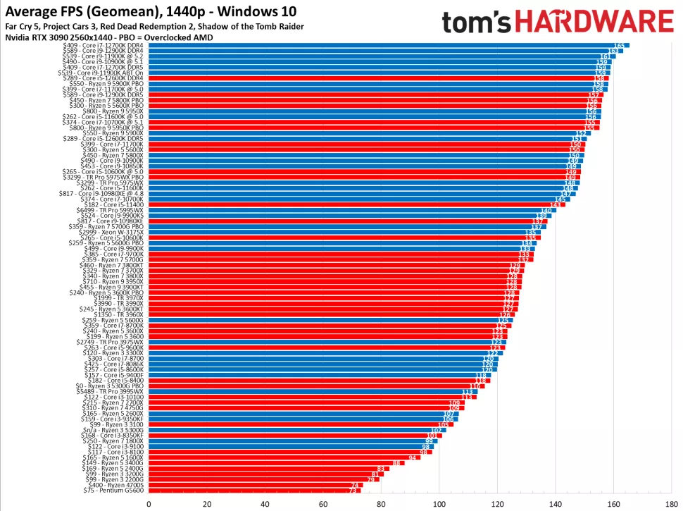 Ebben a szekcióban azt láthatjuk, hogy a Tom’s Hardware sokrétű és rengeteg játékot, programot futtató tesztjén mennyi FPS-t produkáltak az egyes processzorok 1440p felbontásban, Windows 10 alatt.