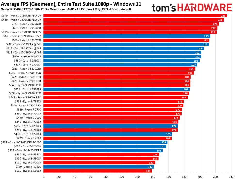Ebben a szekcióban azt láthatjuk, hogy a Tom’s Hardware sokrétű és rengeteg játékot, programot futtató tesztjén mennyi FPS-t produkáltak az egyes processzorok 1080p felbontásban, Windows 11 alatt.