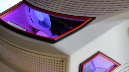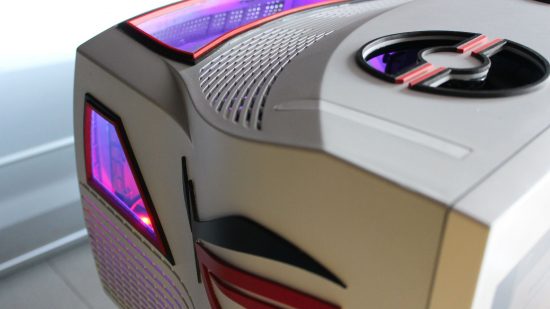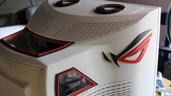 Nem csak a monitor belseje, hanem a külső elemei is átalakításon estek keresztül. A szokásos, ROG termékeke is jellemző kivágások itt is felbukkannak, több helyen egy kis RGB elemmel, komponenssel megfűszerezve. Az eredeti CRT monitor szinte minden alkatrésze ki is került, a megjelenítésért egy ASUS PB248Q IPS panel felel, így a képminőségre sem lehet majd panasz.