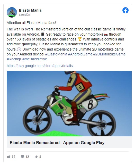Szerdán került fel az Elasto Mania hivatalos oldalára az örömhír, hogy immár Google Play-ről is tölthető a Remastered változat. Azonnal a listák elejére került a hazai felületen, úgy látszik a nosztalgiafaktor sokakban kellemes emlékeket ébresztett. A legjobb az egészben, hogy ingyenes letölthető, így azok is belekóstolhatnak a 2D játékba, akik annak idején nem találkoztak vele. Ha kedvet kaptunk a PC-s változathoz is, akkor azt már 10€ alatt is beszerezhetjük Steamen, de a konzolok saját boltjaiban sem kell sokkal többet fizetni a címért.