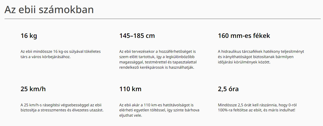 A hivatalos oldal szerint a kerékpár leginkább városi közlekedésre készült, amit egy kerékagymotor hajt az egyik oldalon, ami a kompakt kivitelben is nagy hatékonyságot biztosít. Az intelligens ebiiAssist alkalmazkodik a kerékpáros hajtási teljesítményéhez, a közlekedés körülményeihez és a preferált rásegítési szinthez, és tanulással egyre jobb, személyre szabott kerékpározási élményt biztosít. Az ebii a közlekedési körülmények és a hajtási teljesítmény alapján intuitív módon biztosítja a szükséges teljesítményt, így minden eddiginél egyenletesebb kerékpározási élményt nyújt.