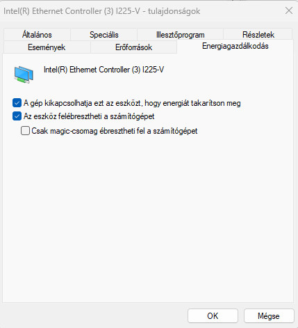 Ekkor a Hálózati kártyák felé kell kell keresgélnünk, majd megkeresnünk az Ethernet hálókártyánkat. Általában a nevében is ott szerepel ez a szó, így nem jelenthet problémát. Esetemben az Intel(R) Ethernet Controller I225-V lesz a jelölt. Az eszközön nyomjunk egy jobb klikket, majd válasszuk ki a Tulajdonságokat, majd pedig az Energiagazdálkodás lehetőségét. Ekkor az alábbi ablakkal kell találkoznunk: