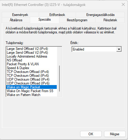 Ajánlott mindhárom opciót kipipálnunk. Ezt követően a Speciális fülre is érdemes áttekintenünk, majd a Wake-on-Lannal kapcsolatos soroknál az „Enabled” értéket keresnünk. Ha ez Disabled, akkor nyugodtan kattintsuk csak át: