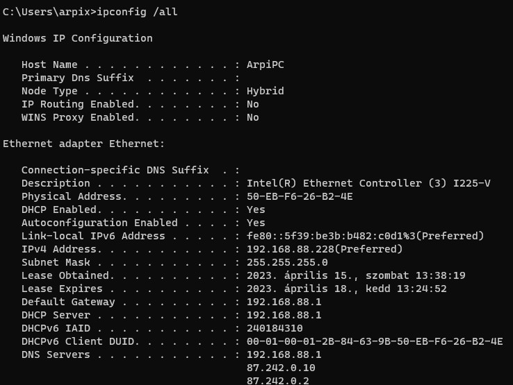 • Majd írjuk be a parancssorba az alábbi szócskát: ipconfig /all