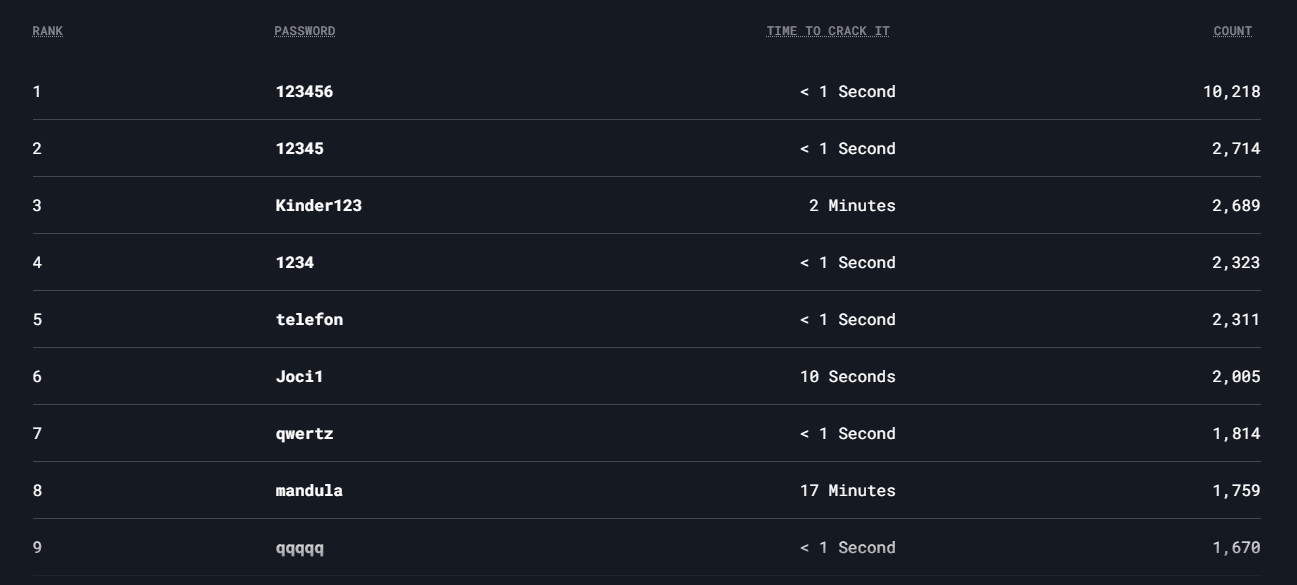 A jelszavak melletti idő azt jelenti, hogy mennyi időbe telik a hackereknek feltörni az adott jelszót. Mint látható, a legtöbb esetben még egy másodperc sem kell ehhez, mégis még nagyon sokan hisznek abban, hogy az „123456” a legerősebb jelszó.