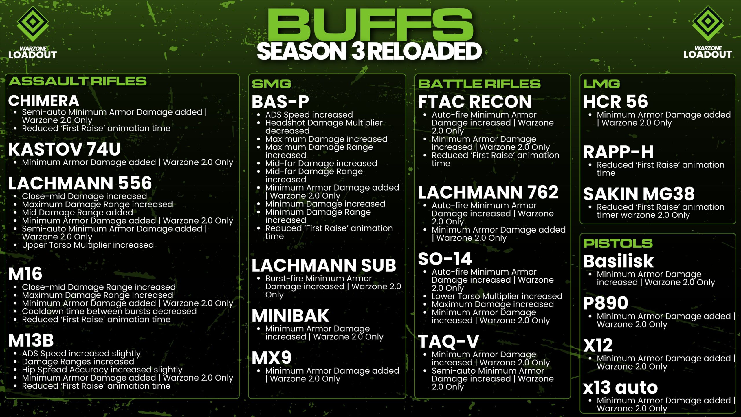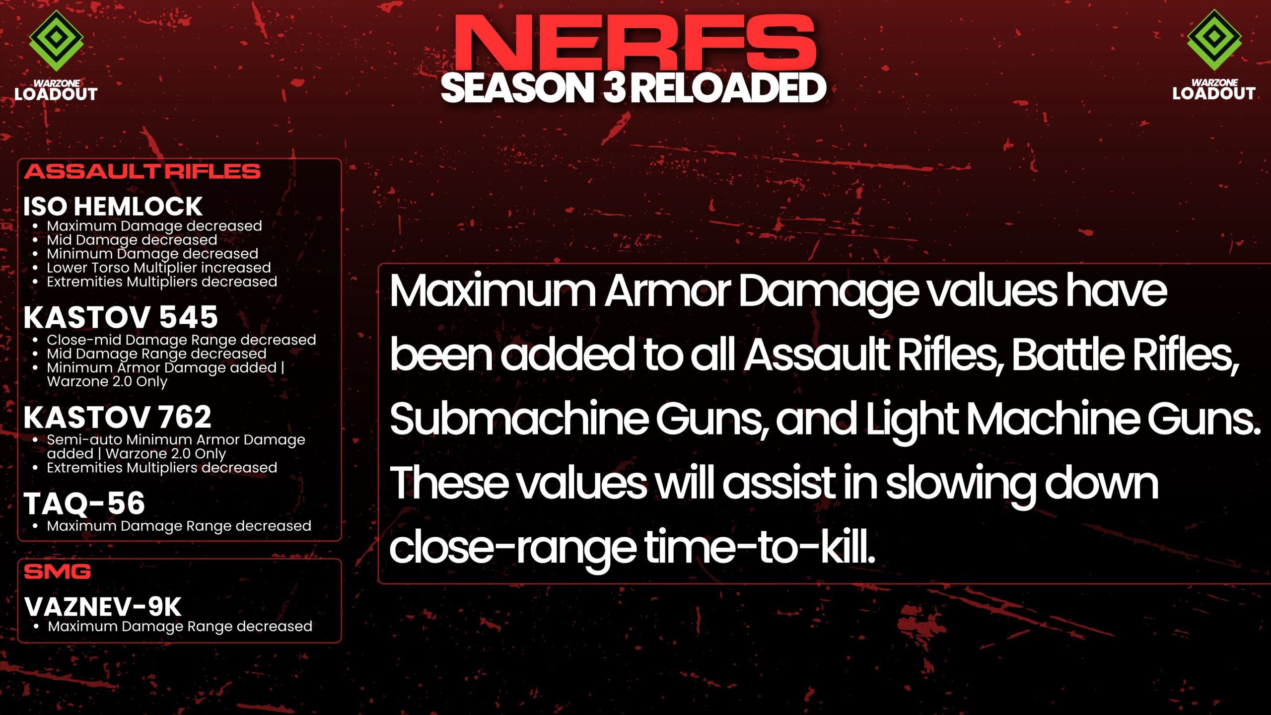 Ahogy arra számítani lehetett, az ISO Hemlock, a két Kastov is több szintű gyengítést kapott. A TAQ-56 és Vaznev-9K-t azonban egy univerzális változtatás miatt találhatjuk meg a listán. A fejlesztők meghatároztak egy maximális sebzést (Armor esetén), mely minden AR, BR, SMG és LMG fegyver esetében implementálásra is került. Ennek célja nem más, hogy a fejlesztők kicsit lelassítsák a közelharcokban tapasztalható darálás gyorsaságát, nagyobb TTK (Time-To-Kill – Öléshez szükséges idő) értéket előidézve. A közösség nem feltétlenül ért egyet ezzel a változtatással, ám ennek hatásosságáról csak az elkövetkezendő egy hét után lehet értelmes következtetést levonni. A frissítés magyar idő szerint szerda este 19:00-kor élesedett, a fenti változásokkal ezt követően érdemes kalkulálnunk.