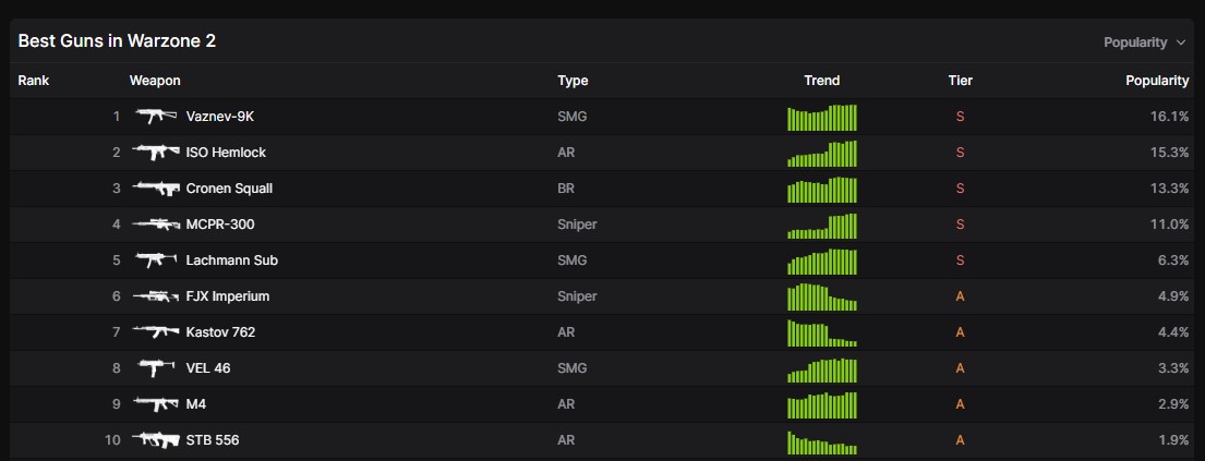 A Vaznev-9 korábban a Modern Warfare II Ranked egyik legnagyobb kedvence volt, ám immár a Battle Royale módban is bizonyíthat. Március közepén már érezhető volt, hogy itt bizony akár egy dobogó is szóba jöhet, úgy tűnik, hogy nem is kellett csalódnunk, visszatért ismét az első helyre.