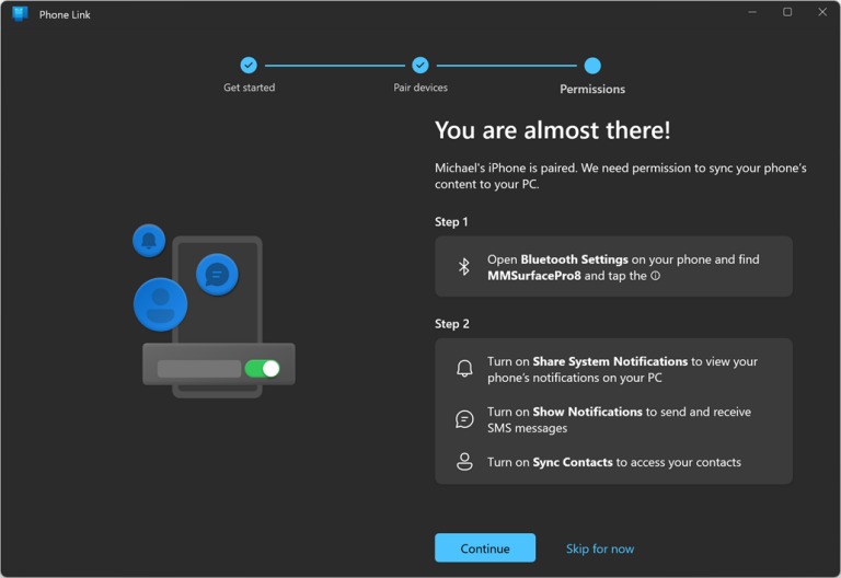 Hatodik lépés: A telefonunk engedélyt kér arra, hogy az értesítéseket továbbítsa az adott laptopra, PC-re. Értelemszerűen engedélyeznünk kell, hiszen ez a Phone Link lényege.