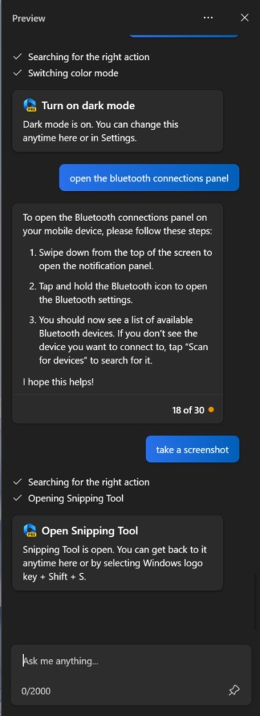 Rengeteg dologra befoghatjuk az újdonságot. Ha nem tudjuk, hogy hol keressük a Bluetooth beállításokat, abban is tud segíteni. Akkor sincs probléma, ha például képernyőképet szeretnénk készíteni, hiszen a „take a screenshot” beírása után meg is nyitja gépünkön a Képmetsző alkalmazást. Sőt, még azt is elárulja, hogy milyen billentyűparanccsal tehetjük meg ezt a jövőben.