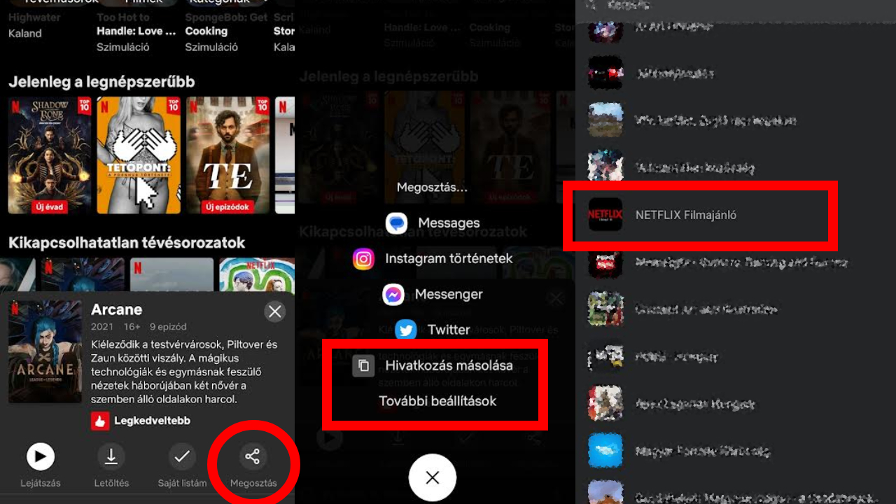 Ha valaki talált egy kifejezetten jó filmet vagy sorozatot, amit szeretne másoknak is a tudtára adni, akkor a mobilos alkalmazásban simán csak le kell nyomni a tartalom adatlapján a megosztás gombot, majd a további beállításokra – itt pedig a választott közösségi oldalra bökve csak beosztani a csoportba a netflixes adatlapot. Így minden csoporttag egyetlen ujjmozdulattal a sorozat Netflix-oldalára jut, ahol a saját listájára mentheti.