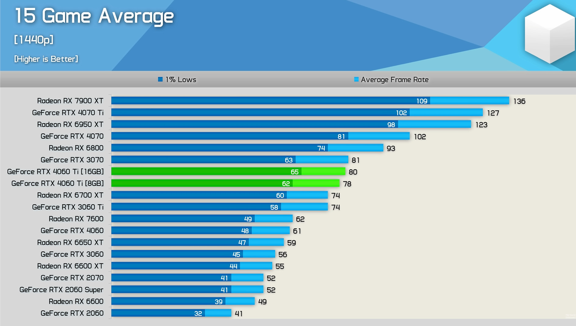 Ahogy arra számítani lehetett, az RTX 4060 Ti 16 GB gyakorlatilag a 8 GB-os 4060 Ti és ennek megfelelően az RTX 3070 szintjét hozza. A DLSS, AV1 támogatás ezúttal sem maradt el, a fogyasztás is csak pár wattal növekedett a dupla memória ellenére. A kártya létjogosultsága azonban erőteljesen megkérdőjelezhető. A 16 GB VRAM nem hozott szinte semmi előnyt, míg az árcédula vészesen közel került a jelentősen erősebb RTX 4070 modelljéhez. Bizonyos esetekben egy-két 16 GB-os 4060 Ti modellért többet kérnek el a gyártók, mint az RTX 4070-ért. Ennek megfelelően szinte teljes nyugalommal kijelenthető, hogy ez lehet az Nvidia egyik legfeleslegesebb kártyája.